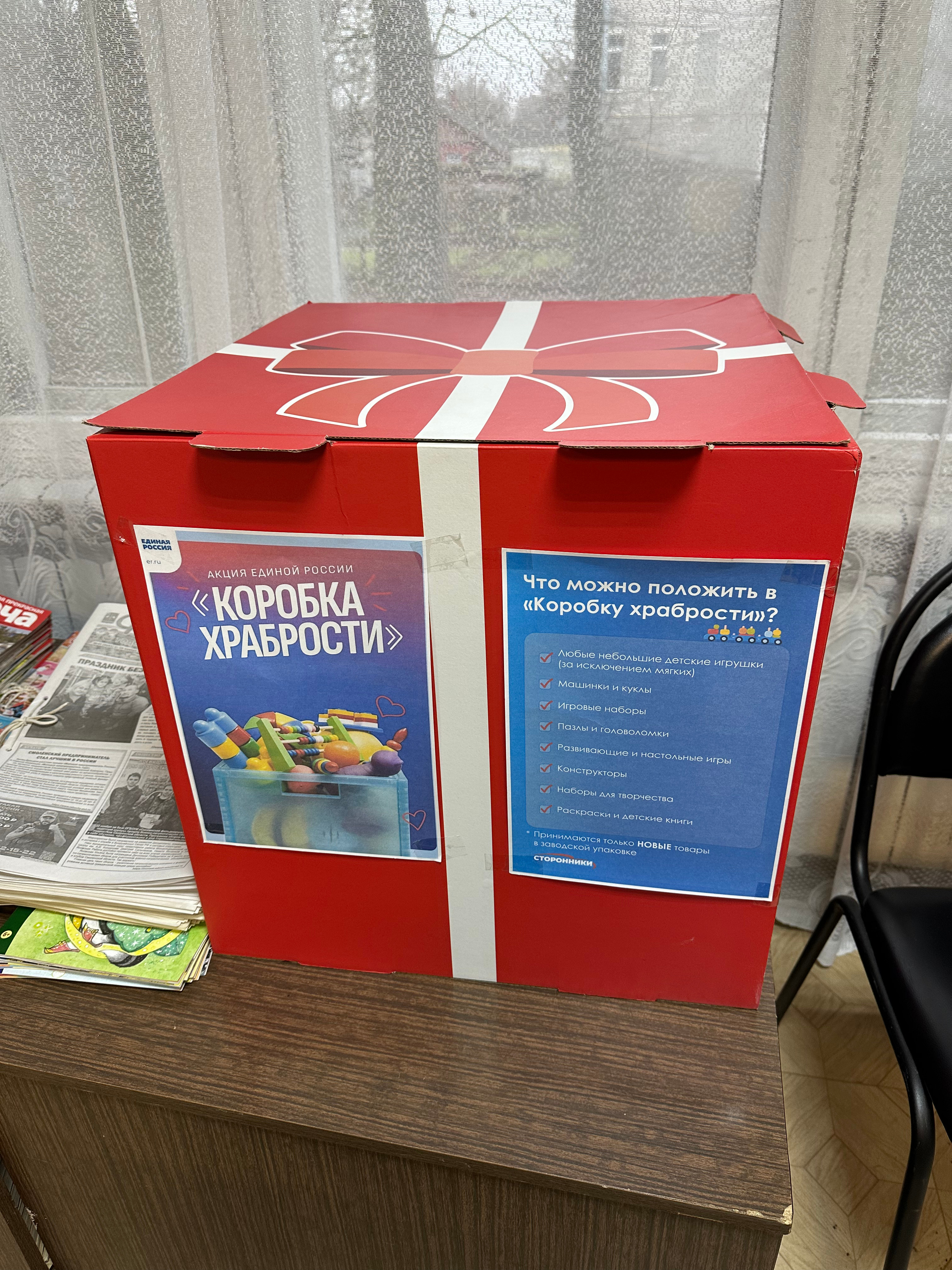 Каждый год партия «Единая Россия» проводит благотворительную акцию «Коробка храбрости». Целью акции является моральная поддержка маленьких пациентов, которые проходят длительное лечение в больницах. Это способ сделать так, чтобы у детей в больнице было больше поводов для улыбки и меньше – для слёз. Подарок, сувенир или игрушка – это большой знак того, что они справляются, что они – молодцы. В рамках поддержки благотворительной акции «Коробка храбрости» Монастырщинский районный суд организовал сбор средств и закупку подарков, которые будут вручены несовершеннолетним пациентам больниц в качестве поощрения за проявленную стойкость после проведения болезненных медицинских процедур. Председатель Монастырщинского районного суда Мильченко Е.А. лично посетила пункт сбора подарков, организованный в детской библиотеке пгт. Монастырщина, куда передала приобретённые для акции «Коробка храбрости» подарки. «Каждый подарок, собранный нами – это послание храбрости. Мы вкладываем в него нашу веру, гордость и пожелание сил для каждого маленького героя, борющегося с болезнью».